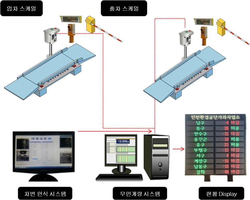 위의 차번인식 차단기 무인판넬 계량 시스템은 기존의 입력 계량 방식과 무인 계량시스템의 업그레이드