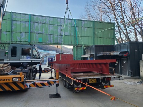 다음날 아침 일찍 계근대 구조물과 장비를 불러 계근대 설치 작업을 진행하였습니다.
