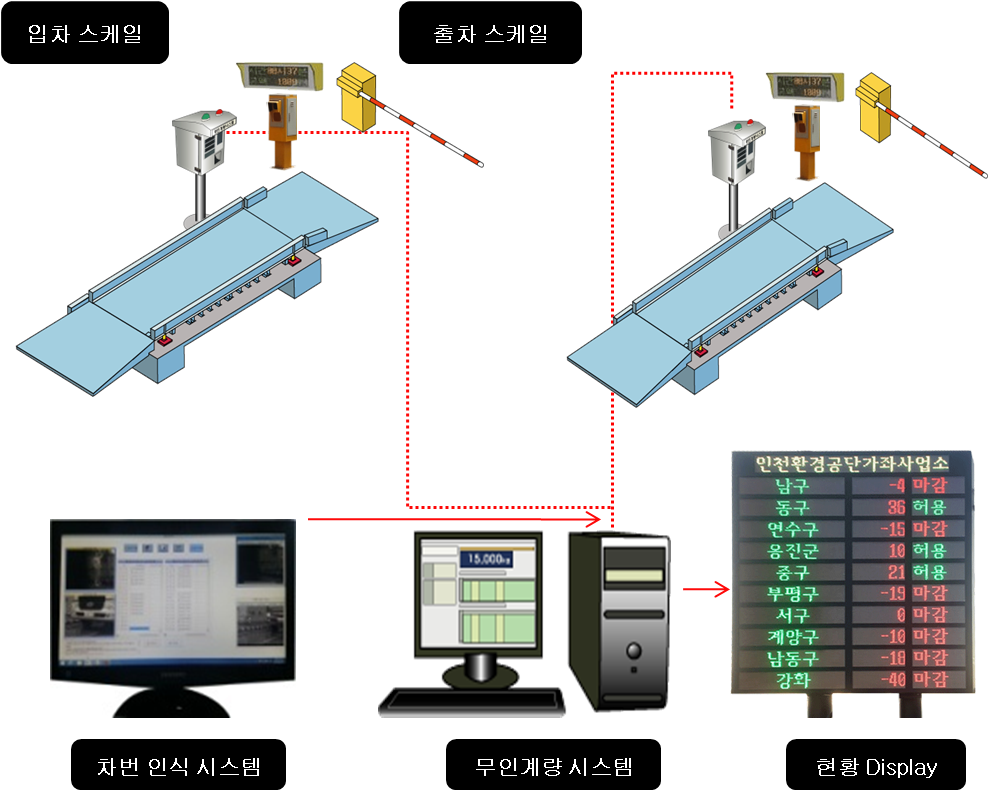 -차량 계근대 무인 계량 시스템은 기존의 입력계량방식의 문제점과 비효율성을 개선하기위해 개발된 시스템으로써, RFID 및 차번인식 시스템 등 첨단 장비와 연동하여 계량자와 괄리자의 편의성을 극대화합니다.